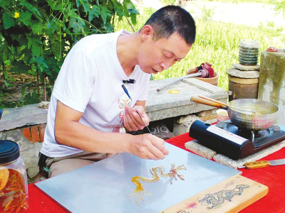 在太行、太岳、中条三山交会的阳城大地,“悠然阳城”的文旅画卷中,总有一抹甜香穿越百年。1980年出生于阳城县河北镇土孟村的宁建鹏,作为家族糖画技艺第四代传人、阳城县糖画县级传承人,三十余载以铜勺为笔、糖稀为墨,在石板之上勾勒民俗风情,于时代浪潮中守护非遗火种。他将家族传承的手艺与现代审美相融,让这门古老艺术焕发新生,用匠心绘就非遗传承的璀璨画卷。
