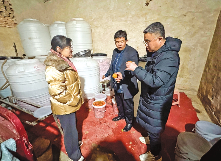 在加工现场,杜更许向回访团展示了引以为傲的“水泡保鲜”技术:将精选硬柿浸入特定水质中,通过隔绝氧气和精准控温,实现长期保鲜,四季可售。看到此情此景,回访导师、山西农业大学园艺学院副院长李磊研究员不由得发出赞叹:“农业高手在民间!”这项源自实践智慧的“土办法”,有效破解了鲜柿集中上市、难以贮运的瓶颈,为延伸产业链奠定了基础。如今,合作社已发展出鲜柿、柿饼、柿子醋、柿子酒等多种产品。