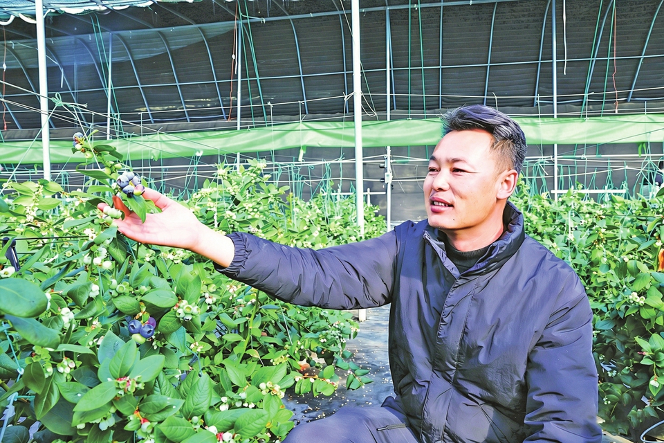 • 北三泉村蓝莓种植示范基地管理人员彭奋伟介绍“花香蓝莓”的特性。