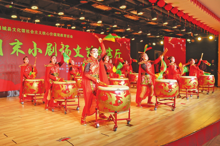 12月27日,阳城县凤城镇北安阳村农民演出代表队正在进行鼓舞表演。近年来,该县持续推出“周末小剧场”系列活动,既有效弘扬优秀传统文化,也丰富了群众假日文化生活。