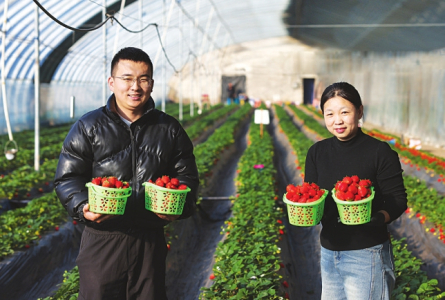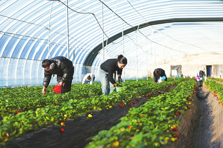 1月8日,太原市晋源区花塔村都市农场设施大棚里的草莓成熟进入采摘季,农场的员工正在采摘草莓。近年来,晋源区都市农场以设施果蔬种植为核心,培育雪兔草莓、蓝宝石葡萄、美早樱桃等品种,成熟期从当年12月覆盖至次年11月,实现“天天有水果、周周有蔬菜”。