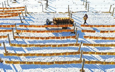 1月6日,襄汾县南贾镇南刘村,村民正在加工晾晒红薯粉条。南刘村粉条制作加工历史悠久,近年来农产品产业链不断延长、附加值明显提高,有效拓宽农民增收致富途径,粉条加工成为当地冬闲经济发展的支柱产业。