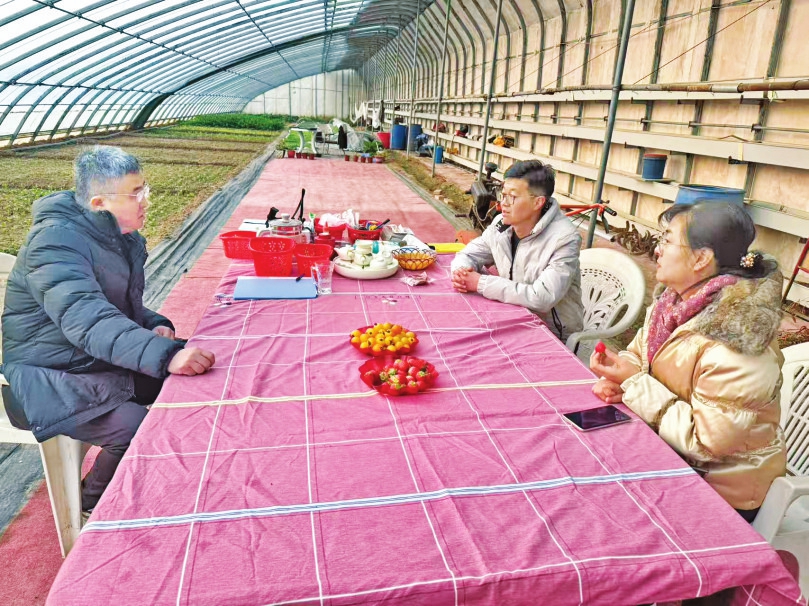 正说着,李磊研究员走进大棚。二人站在草莓垄边的品鉴台前交流起来。