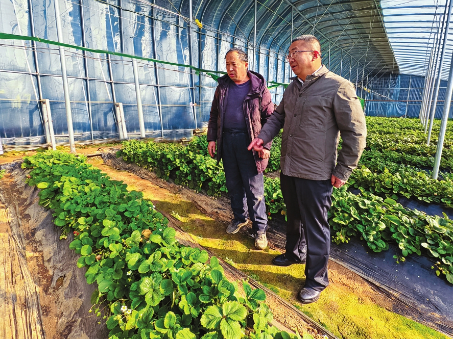 图③:张千忠(右)在草莓大棚里介绍园区冬季生产情况。