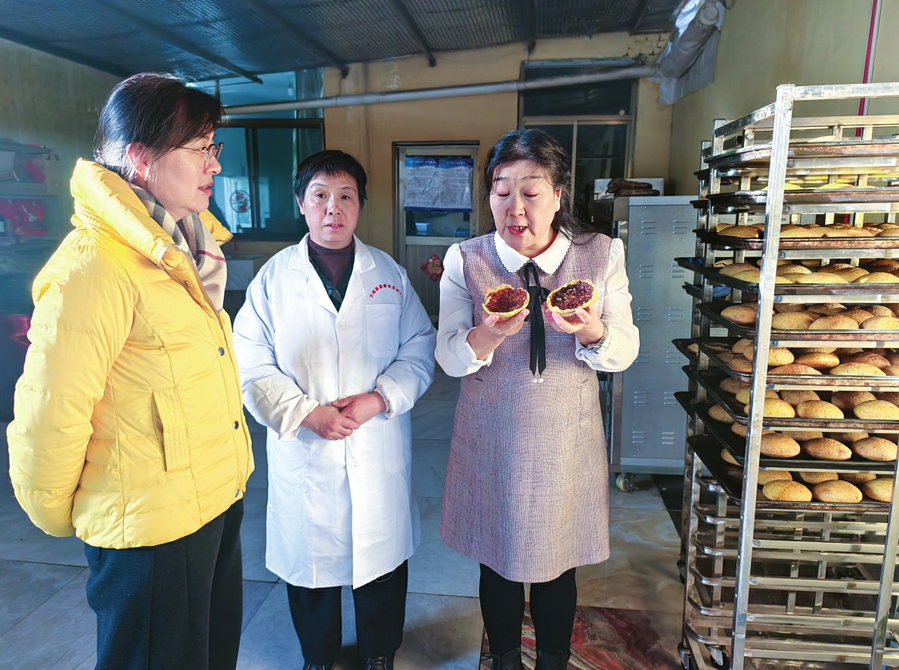 图①:李慧娟(左二)向回访导师介绍糕点的产品特色。
