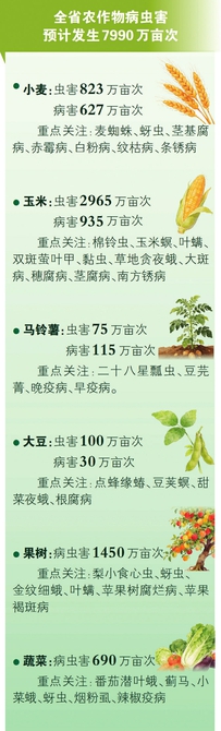 编者按 近日,省植物保护植物检疫中心组织省内植保机构、山西农业大学、省气候中心等多方专家,综合研判病虫源基数、种植制度、作物布局及气候等核心因素后认为,2026年全省小麦、玉米、马铃薯、杂粮等作物主要病虫害将呈中等(局部偏重)发生态势,预计全年农作物病虫害发生面积达7990万亩次,较上年增幅7.5%。粮安天下,农稳社稷。希望各地农业部门和广大农民锚定重点病虫、聚焦关键产区、做好监测预警,精准施策筑牢农业生产安全防线,最大限度降低作物产量损失。