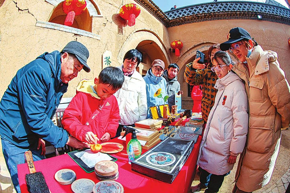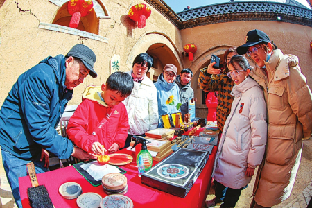 2月10日是北方小年,平陆县杜马乡东坪头村地窨院内张灯结彩,年味浓郁。活动现场,村民们欢聚一堂,剪纸、花馍、雕刻等非遗技艺轮番亮相,让游客感受黄土高原独特的文化魅力,共同迎接马年春节的到来。图为大家在地窨院内体验非遗技艺。