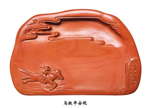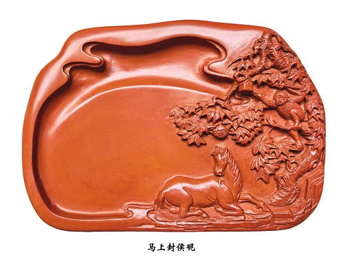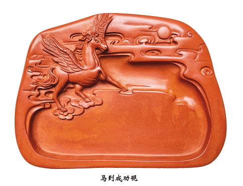 其次为“马到成功砚”。砚面设计着力表现动感与气势,椭圆形制上,一匹展翅骏马昂首嘶鸣,四蹄蹬空,鬃尾如烈焰飞舞,将“奔腾”的瞬间化为永恒。周身祥云缭绕,极具视觉张力。它立体呈现马到成功这句吉祥祝福的内涵,也深情礼赞一马当先的奋进精神。制砚师巧用浅浮雕与线刻技法,使马匹的肌肉与鬃毛充满力量感,激励砚主人以奋进之姿,开拓前行。