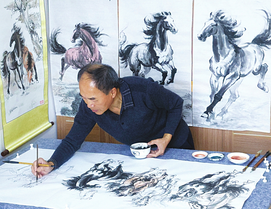 1月29日,万荣县南张乡太赵村乡土画家张富宽在精心创作国画《八骏图》。马年春节即将到来之际,张富宽在自家工作室为乡邻亲朋精心创作了《马到成功》《骏马奔腾》和《八骏牧春》等28幅马元素国画,将形态各异、体态雄健、惟妙惟肖的一匹匹骏马跃然纸上,以艺术的正能量激发人们跃马扬鞭的勇气,鼓足马不停蹄的干劲,迎接“十五五”开局之年全方位高质量发展的开门红。