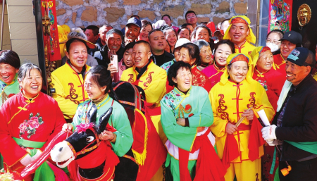 队伍阵容齐全,配有传统乐队,腰鼓队,还有活灵活现的狮子舞,风趣幽默的拉毛驴,丑角老汉老婆等特色表演,更有民间小调“小会子”登场献艺,乡土气息浓郁,年味十足。