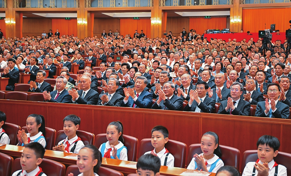 9月3日,纪念中国人民抗日战争暨世界反法西斯战争胜利80周年文艺晚会《正义必胜》在北京人民大会堂隆重举行。习近平、李强、赵乐际、王沪宁、蔡奇、丁薛祥、李希、韩正等党和国家领导人,与约6000名中外人士一起观看晚会。新华社记者李响摄