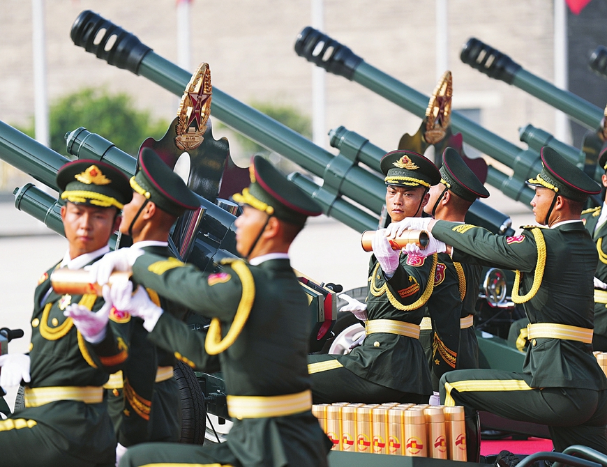 实现精准鸣放离不开先进的礼炮控制设备和对每一个细节的严格把控。“我们对炮弹爆响时间的一致性要求极高。”裴卫栋说,日常送检的批次炮弹偶有10至20毫秒的延时差异,为确保阅兵时齐鸣共响,每一发炮弹的电阻都要逐一实测、精准标定、精确分组;采取备用控制车及蓄电池等措施,对炮弹匹配优化,提升鸣放控制车的可靠性。三人跪姿操炮动作稳健有力、舒展流畅,保证阅兵礼炮所有细节严格控制在统一标准内,以实现分毫不差的精准鸣放。