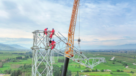 近日,国网山西送变电公司施工人员在忻州市五台县,对忻州北—阳泉500千伏线路工程G16塔开展流动式起重机组塔作业。该工程线路总长158.757公里,包含247基铁塔,目前已完成126基基础施工,14基铁塔组立。工程投运后,将进一步完善区域电网布局,增强电力输送效能,为地方经济社会发展筑牢电力支撑。