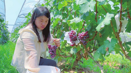 陈晓燕站在田埂上,脸上露出暖暖的笑容。二十多年前,她经过多方考察,在这里种下了第一株巨峰葡萄苗。别人用农药防病虫害,她扛着锄头一点点除杂草,慢慢琢磨出管理“土办法”:给葡萄套上透气纸袋防污染,搭起遮阳棚调节光照,拉起细密的防鸟网护果实,连灌溉都用深井水喷灌。有人说她傻,放着省力的法子不用。她却笑着回答:“我就想让大家吃得放心。”