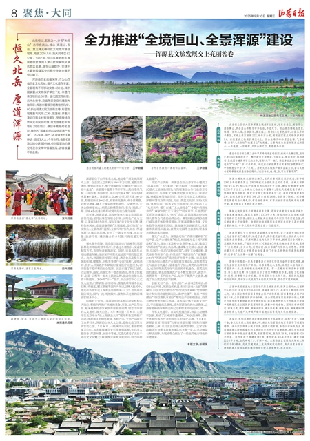 浑源县历史底蕴深厚,作为山西省历史文化名城,境内文化遗存丰富,全县现有不可移动文物488处,其中国家重点文物保护单位7处,非遗代表性项目达68项。金代圆觉寺砖塔、元代永安寺、文庙等历史文化瑰宝大放异彩;浑源州署展示明清官府风华,60多处明清大院及古街古巷,彰显古城厚重与风华;二岭、龙蓬峪、荞麦川凌云口等乡村旅游景区,凭借独特自然风光与民俗风情,成为游客打卡新地标;北岳恒山、悬空寺更是闻名遐迩,被列入“国家自然和文化双遗产名录”。2024年,国产3A游戏大作《黑神话:悟空》大火,今年8月,电影《浪浪山的小妖怪》热映,作为取景地的悬空寺及永安禅寺借着东风,游客数量不断走高。