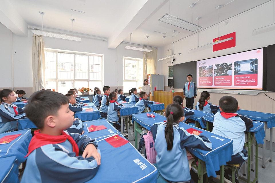 9月18日,吕梁市离石区朝阳小学的学生们正在学习九一八事变历史知识,以此铭记历史、缅怀先烈。