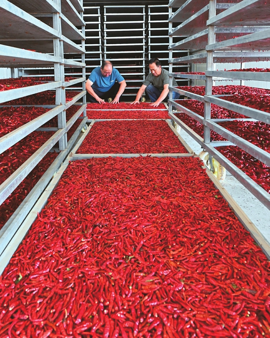 9月15日,垣曲县伟勇种植专业合作社内,村民对辣椒进行检查、打包。垣曲县蒲掌乡以合作社为依托,规模化发展辣椒种植,采用先进设备进行烘烤加工,产品销往四川、重庆等地,亩均收入可达4000多元。