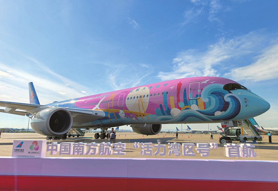 这是停靠在广州白云国际机场的“活力湾区号”(9月19日摄)。9月19日下午,中国南方航空首架十五运会主题彩绘飞机“活力湾区号”首航。“活力湾区号”机身以蓝、粉、黄等色彩串联,融合了港珠澳大桥、十五运会吉祥物“喜洋洋”和“乐融融”、海鸥及木棉花等元素。