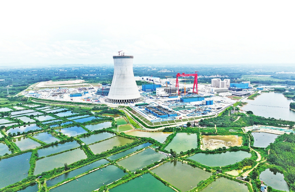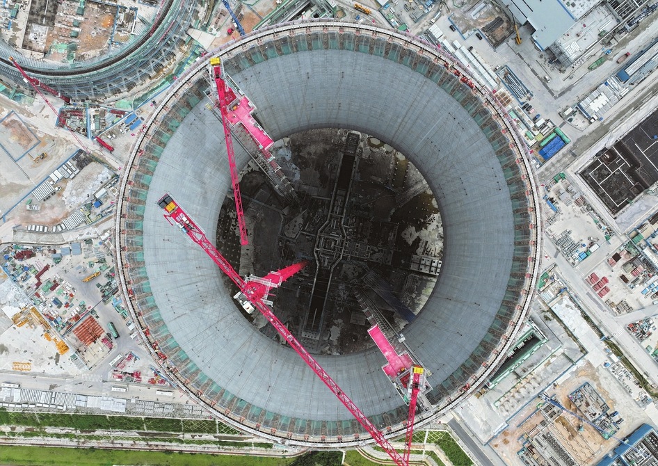 图为9月17日拍摄的国家电投广东廉江核电项目冷却塔。9月17日,中国首个采用海水二次循环冷却技术的广东廉江核电项目,顺利完成超大型高位集水海水冷却塔主体结构施工,即将全面进入设备安装与系统调试阶段。