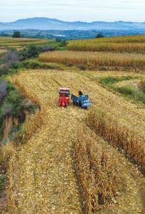 9月21日,寿阳县平头镇榆城村农民在山地梯田里收割玉米。仲秋时节,黄土高坡山梁沟峁间种植的玉米、谷子等作物陆续成熟,共同织就一幅金秋丰收画卷。