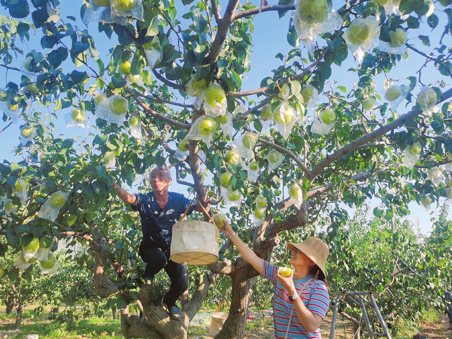 9月18日,原平市子干乡子干村,村民在采摘酥梨。近年来,该乡着力发展酥梨特色产业,不断开拓新市场,将梨果销往北京、上海、深圳等地。梨果成为带动农民增收的“致富果”。