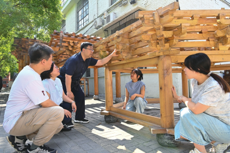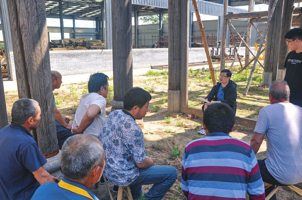 王崇恩为文保志愿者讲解木构建筑搭建和榫卯拼接传统营造技艺。