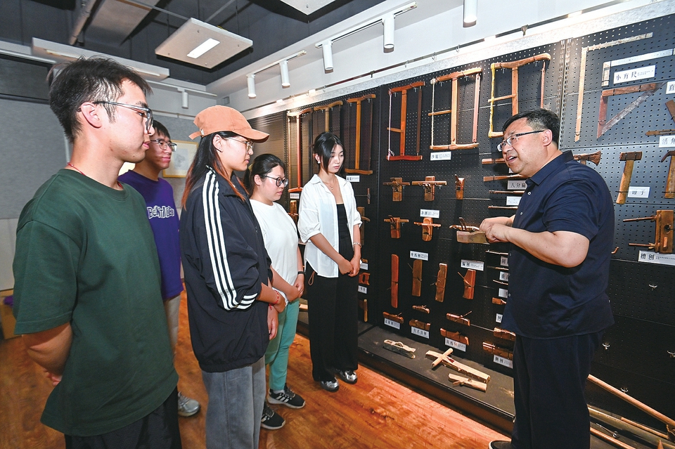 给学生们讲解传统木匠工具。