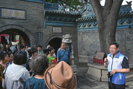 在太原纯阳宫,为游客讲解其建造历史渊源。