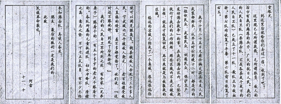 1937年11月10日,梁雷在写给好友姚雪垠的信中说:“……敌人的后方有我们雄厚的兵力、广大的抗日人民。我们的人民自卫队(系游击队,不是各县成千成万的人民自卫队)已成立了十一队,数队正与敌血拼。第七队昨收复了平鲁,第六队前日收复了右玉。我于十月二十五日又兼任偏关县县长及人民武装部部长,从早五时忙到晚十二时,都是作的‘组织民众,武装民众,训练民众,保护生产,发动游击战争’的事……朔县被敌人杀死了三千多人民。宁武城内几乎被敌人烧光……老百姓遭受敌人直接的侵害,差不多都觉悟了……各队所属的儿童挺进队、妇女冲锋队,情绪之高,意志之坚,不下于正式队员,有不少已经参加游击队,真使人奋发!朋友,最后的胜利一定是我们的!”