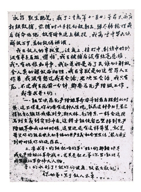 我在敌人的牢狱里、法庭上、拷打中、利诱中始终没有半点屈服、惧怕。我在被捕后没有丝毫悲伤,我只有仇恨和斗争。我知道我是为了民族的解放、全人类的解放而牺牲。我在牢狱是向这些罪人工作着。我没有想过我再会活,也决不会活,我只有死。不过我在死前一分钟,都要为无产阶级工作……”