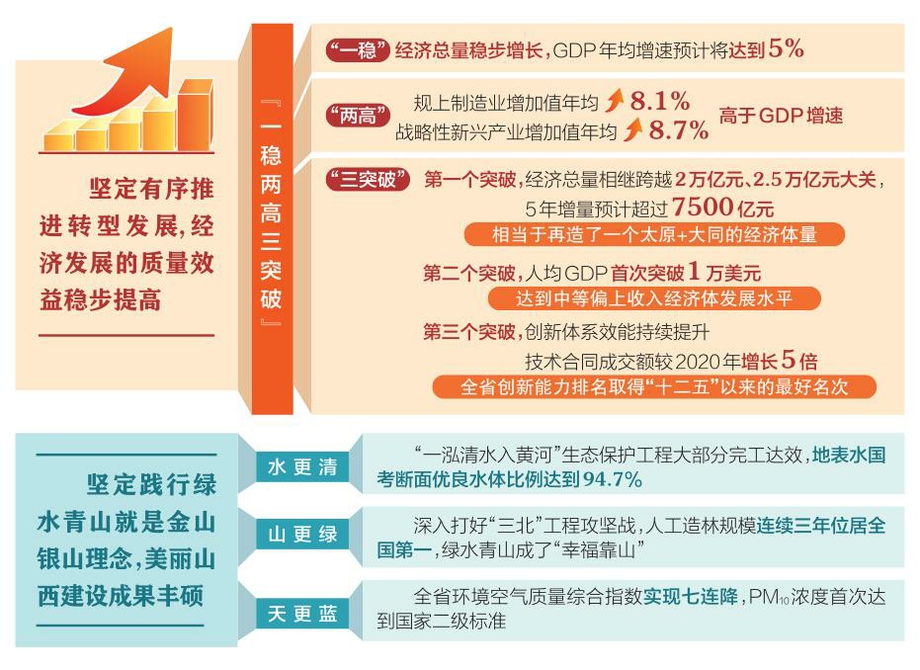 省发展改革委党组书记、主任陈磊表示,具体可以用“一稳两高三突破”概括:“一稳”就是经济总量稳步增长,GDP年均增速预计将达到5%。“两高”就是规上制造业、战略性新兴产业增加值年均分别增长8.1%、8.7%,高于GDP增速。“三突破”:第一个突破,经济总量相继跨越2万亿元、2.5万亿元大关,5年增量预计超过7500亿元,相当于再造了一个太原+大同的经济体量。第二个突破,人均GDP首次突破1万美元,达到中等偏上收入经济体发展水平。第三个突破,创新体系效能持续提升,技术合同成交额较2020年增长5倍,全省创新能力排名取得“十二五”以来的最好名次。