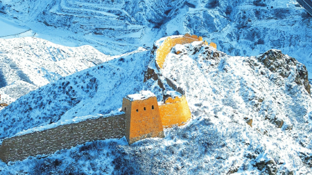 12月13日,雪后的广武长城宛如一条巨龙盘旋在山脊之间,呈现出沧桑壮美的独特景观。