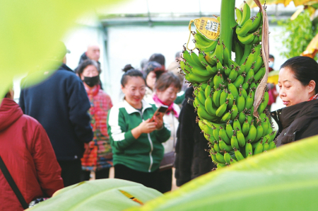 2025年12月24日,忻州市忻府区光子农业合作社蔬菜大棚示范园区内,游客正在观赏热带植物。该园区引进种植香蕉等热带植物,形成了集观光农业、农耕体验、教学科研为一体的多功能现代化农业园区,解锁冬季观光旅游消费新场景。