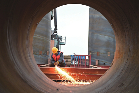 1月1日,在长赣高铁赣州赣江铁路特大桥施工现场,工人在施工作业。元旦假期期间,许多行业的劳动者依然坚守岗位,在工作中度过假期。