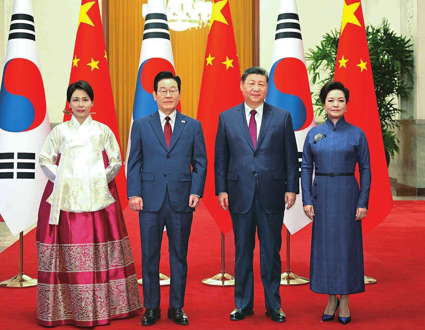 会谈前,习近平和夫人彭丽媛在人民大会堂北大厅为李在明和夫人金惠景举行欢迎仪式。