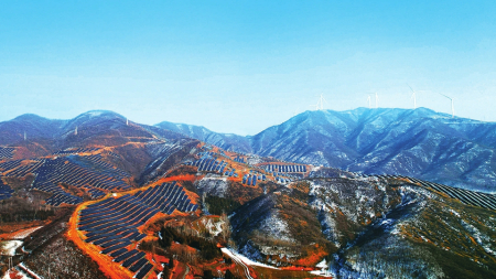 一月三日,俯瞰垣曲县皋落乡东山村已并网发电的光伏基地,光伏板熠熠生辉。近年来,垣曲县充分依托风、光、水等资源,打造新能源产业基地,有效促进当地绿色低碳转型发展。