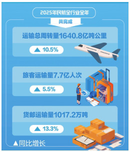 中国民航局局长宋志勇表示,截至2025年,我国航空总人口超5亿,我国成为全球第一航空人口大国。 2025年,民航全行业运输总周转量、旅客运输量、货邮运输量较2019年增长26.9%、16.7%、35.1%,民航旅客周转量在综合交通运输体系中占比39%,较2019年提高6个百分点。 “十四五”时期,C919、AG600等国产航空产品完成适航审定,我国运输机队中国产飞机达220架,空管系统新增主要装备国产化率达到96%,北斗卫星导航系统在我国民航大规模应用。