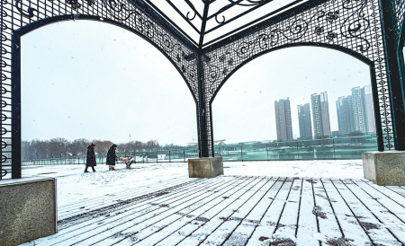 1月4日,长治市潞州区迎来降雪天气,淮海公园内银装素裹,雪覆枝头,市民漫步赏雪,尽享魅力冬日时光。