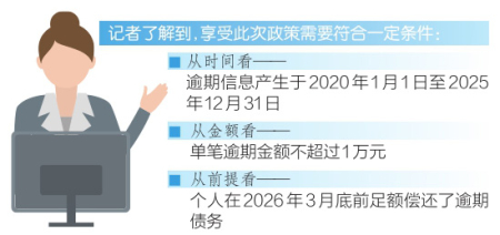 记者了解到,此次政策设置了3个月宽限期,个人逾期债务结清时间的最后时限是2026年3月31日。