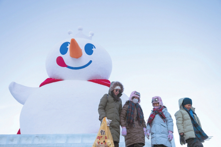 2026年1月1日,游人在哈尔滨市道外区闯关东广场合影。随着第42届中国·哈尔滨国际冰雪节启幕,“冰城”今冬再次“美出圈”。