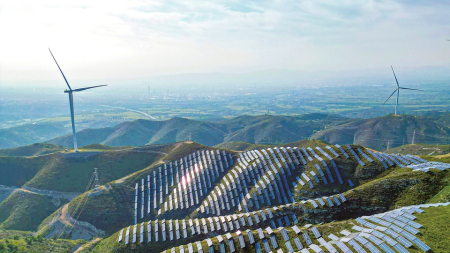 太原市阳曲县凌井店乡窑沟村外,山脊线上的风力发电机正徐徐转动,源源不断地向电网输送绿色能源。由中核汇能山西能源有限公司建设的阳曲县凌井店乡100兆瓦风力发电+10%储能项目,于2023年6月10日并网发电,与原并网的200兆瓦光伏项目共同组成太原市首个风光储一体化综合能源项目。