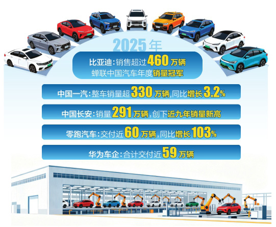 2025年销售超过460万辆,比亚迪蝉联中国汽车年度销量冠军。从“全价格带覆盖+爆款车型矩阵”展现硬核产品力,到核心三电、云辇智能底盘等全产业链技术升级,再到以全球化战略布局打开全新增长空间……比亚迪的全面突破,正是中国车企向新向优迈进的生动缩影。