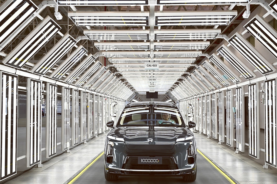 图为1月6日,蔚来第100万台量产车下线。1月6日,在安徽省合肥市新桥智能电动汽车产业园蔚来第二工厂,蔚来第100万台量产车下线。