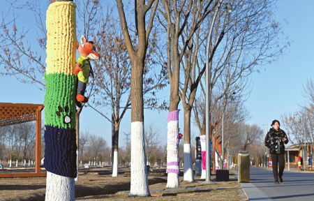 一月八日,太原植物园内,部分树木“穿”上了手工编织的“毛衣”,活力满满的多巴胺配色为冬日增添了别样生机,成为园区内一道亮丽的风景线,吸引游人拍照留念。