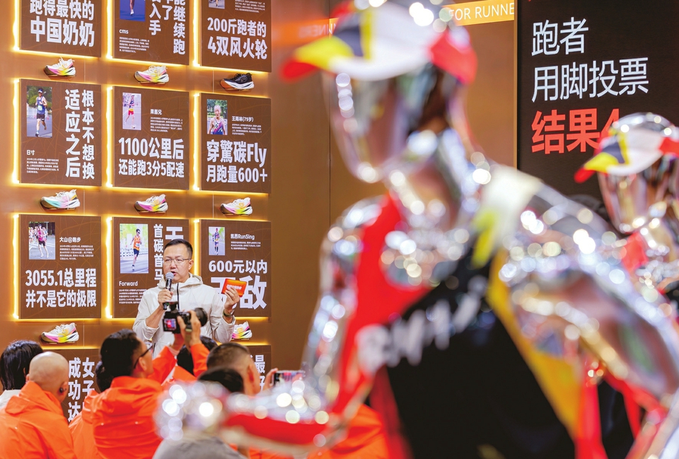 1月8日,一家体育用品厂商在博览会上推介自己的马拉松赛事体育用品。当日,为期三天的第七届中国马拉松博览会在福建厦门开幕。本届博览会围绕“体育+”生态立体布局,全新升级规划了体育赛事、品牌企业、体育用品及装备等八大展区,进一步拓展马拉松产业的边界。