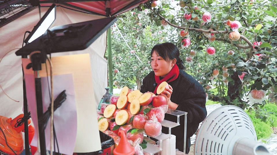 “咱们的苹果皮薄肉厚,味甜汁多,特别好吃!”1月5日,在北景乡喜多鲜电子商务有限公司的直播间,主播王迪站在镜头前,实时解答网友关于口感、规格、发货时效的提问。