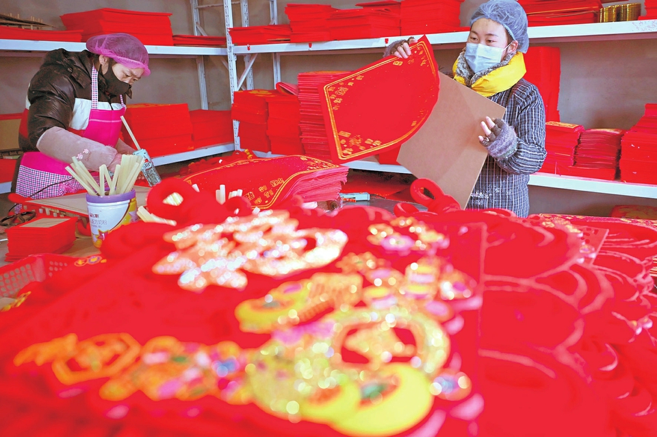 1月6日,山西紫曼工艺品制造有限责任公司生产车间内,工人正在加工节庆装饰品。随着春节临近,节庆市场逐渐升温,该公司加工的中国结、福字、香包等装饰品深受市场青睐,有效带动当地农村妇女就业增收。