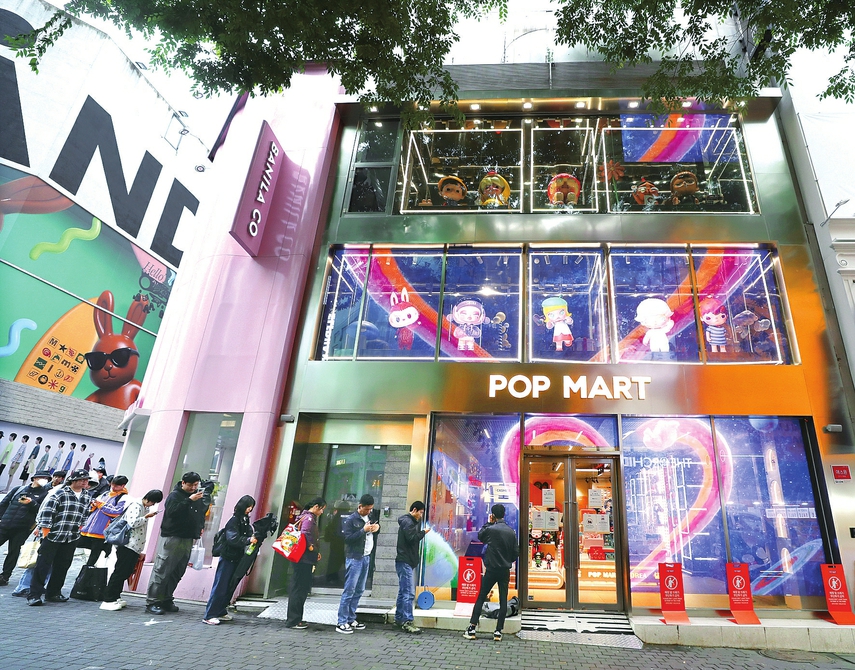 消费者在韩国首尔明洞街区的泡泡玛特店面前排队。