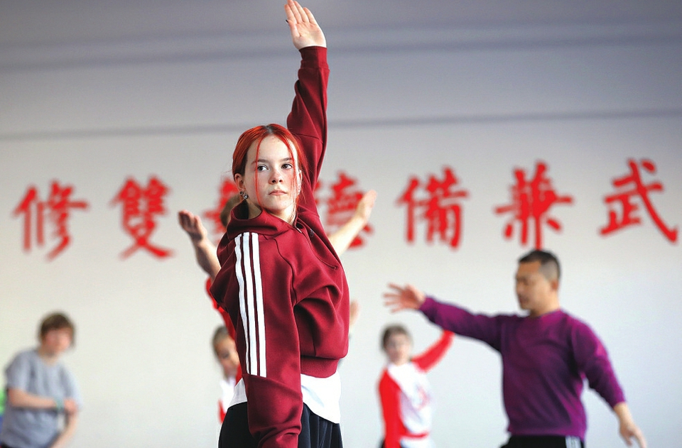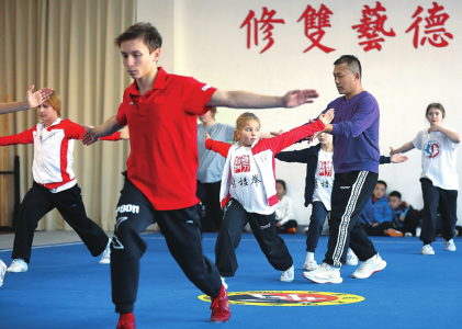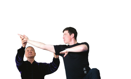 武师王志海(左)纠正一名俄罗斯武术爱好者的动作。
