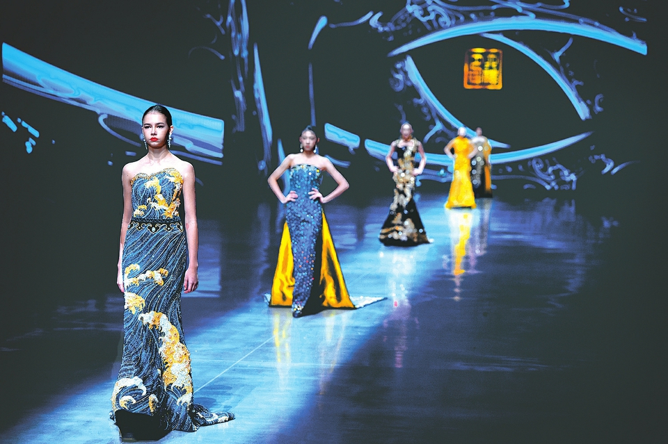 1月9日,2026第十二届哈尔滨国际时装周在哈尔滨西城红场启幕。本届国际时装周以“冰雪筑霓裳,时尚链世界”为主题,举办四类大秀、两场沙龙、两项比赛等系列活动。图为模特在开幕秀上展示服装。